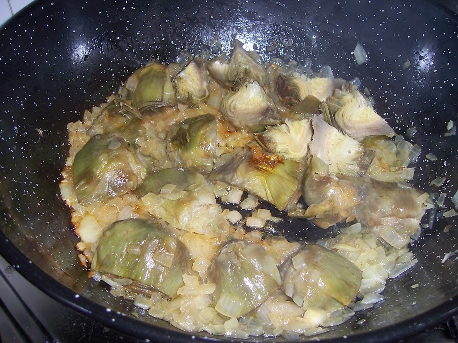 Cuando la cebolla empiece a estar doradita vamos añadiendo las alcachofas cortadas por la mitad o a cuartos si son muy grandes, las doramos y apartamos en un plato.