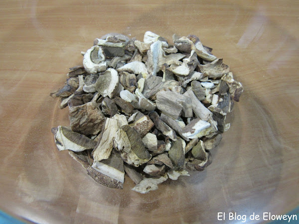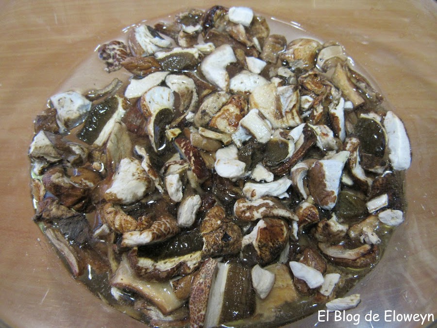 Si usáis boletus sin desecar, limpiadlos con un paño húmedo y partidlos en trocitos. Si usáis boletus desecados como yo, ponedlos en un bol.