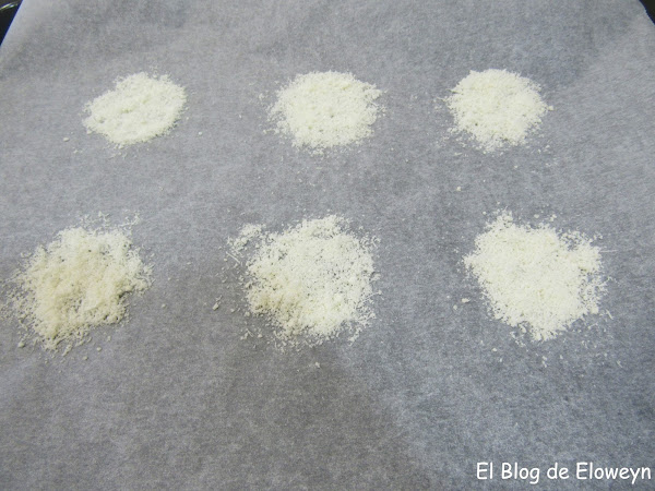 Precalentar el horno a 180º con calor arriba y abajo. Ponemos papel de hornear sobre una bandeja y distribuimos el queso parmesano en forma de círculos.