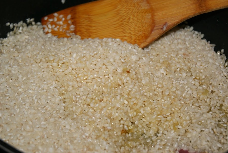 Añadimos la mantequilla y, cuando esté derretida, el arroz. Damos unas cuantas vueltas al arroz en el aceite caliente sin llegar a dorarlo.