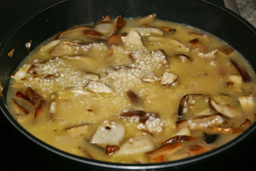 Le añadimos los boletus (reservamos unos cuantos para la decoración final), el vasito de vino, un cucharón de caldo caliente y la sal, sin dejar de remover. Cuidado con la sal porque el caldo ya la lleva y es mejor rectificar en el último momento