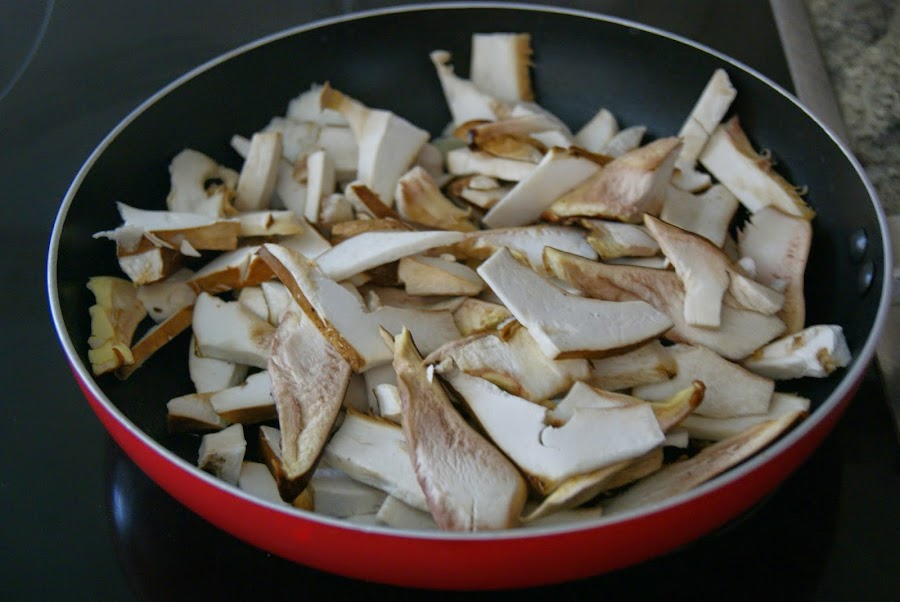 Empezamos laminando los boletus, les echamos sal y los salteamos ligeramente en la satén con aceite de oliva. Los reservamos.