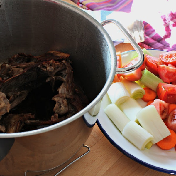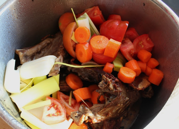 Doramos/quemamos la carcasa a fuego vivo y añadimos las verduras troceadas. Cocinamos, 5-10 minutos, añadimos el vino tinto y dejamos reducir 5-8 minutos más.