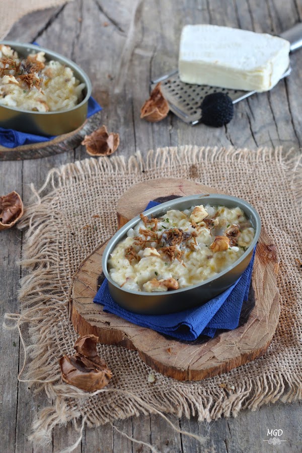 Servimos el risotto, acompañado de unas nueces picadas y trufa rallada.