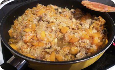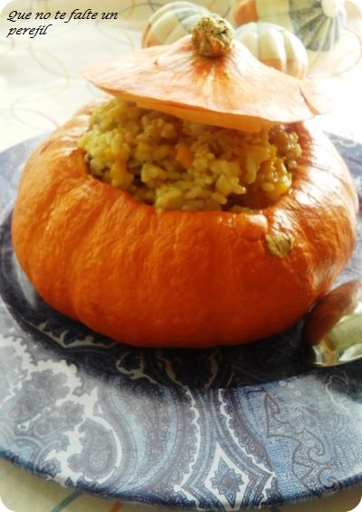 Al final pon la cucharada de mantequilla y el queso rallado. Remueve y pon el arroz dentro de la calabaza. Sirve de momento.