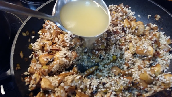 Añadimos un primer cazo de caldo y removemos hasta que se consuma.