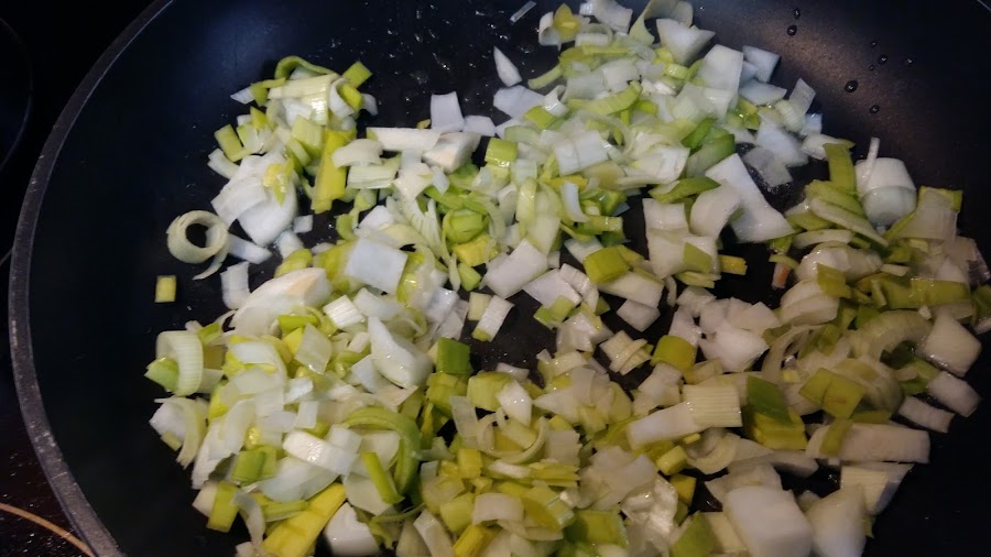 Empezamos sofriendo el puerro y la cebolla cortado a daditos.
