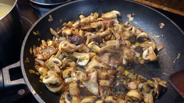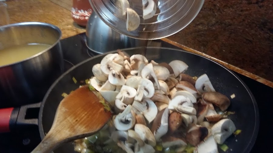 Cortamos los champiñones y setas variadas y los añadimos.