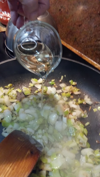 Añadimos el vaso de vino blanco y dejamos que evapore el alcohol.