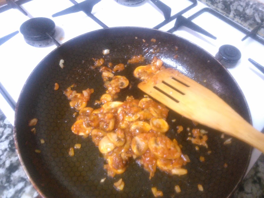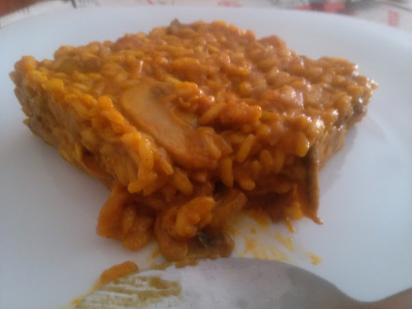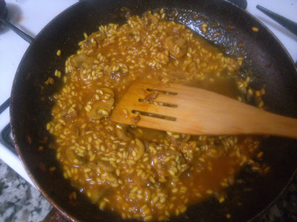 En primer lugar, haremos el sofrito. Pochamos la cebolla, el ajo y los champiñones. Incorporamos el tomate, el curry y el arroz y cocinamos hasta que esté transparente.