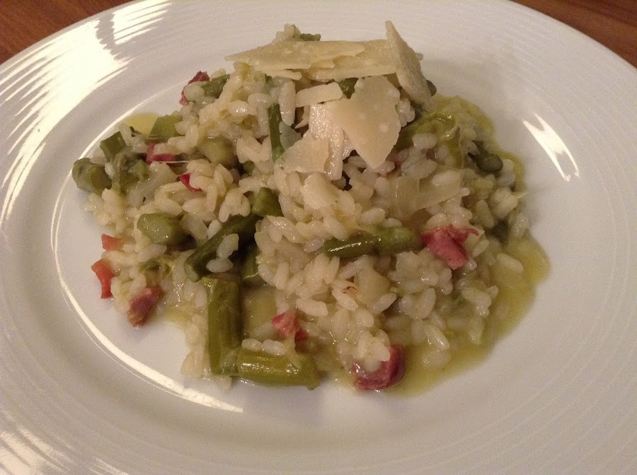"Famoso es el risotto alla milanese, que es el arroz dorado de la Lombardía. (...) Pretenden los tratadistas lombardos de gastronomía y otros graves eruditos que no se conoce el nombre del inventor del arroz a la milanesa pero sí el año exacto de su creación: 1574. Las crónicas lisonjeras y de bella invención aseguran que lo creó un discípulo del maestro Valerio de Flandes, el artista que hizo las vidrieras del duomo de Milán. Este mozo apuesto se enamoró de la hija del viejo maestro flamenco, que era bellísima como corresponde a toda protagonista de leyendas, pálida y muy rubia. La pidió en matrimonio y se celebró la boda. En el festín nupcial, el joven esposo, para solemnizar el acontecimiento, hizo preparar un plato de su invención, que no era otro que el arroz coloreado con el azafrán, especia que venía de Venecia. El avisado doncel conocía el poder colorante del azafrán, y además, sabía también que era innocuo. (...) Cuando el arroz llegó a la mesa, los alborozados comensales se maravillaron de aquella impresionante fuente de granos de oro viejo, como las pepitas que traían los antiguos ríos ibéricos, y desde entonces se utilizó el azafrán para condimentar el arroz."Como decía, en cada región se elabora de una manera distinta, pues hay zonas en las que el caldo se agrega al principio, mientras que en otras, se agrega después. La variedad de arroces que se suelen utilizar son el "carnaroli", "arborio", "maratelli", "baldo", "vialone nano"... que le aportan una textura cremosa gracias al almidón, es por ello que el arroz no debe lavarse previamente y debe removerse constantemente durante su cocción (aunque tengo que confesar que en esta ocasión utilicé un arroz común). Antes del arroz, se hace primero un sofrito con ajo y cebolla que le aportará sabor.