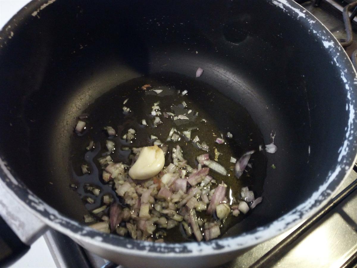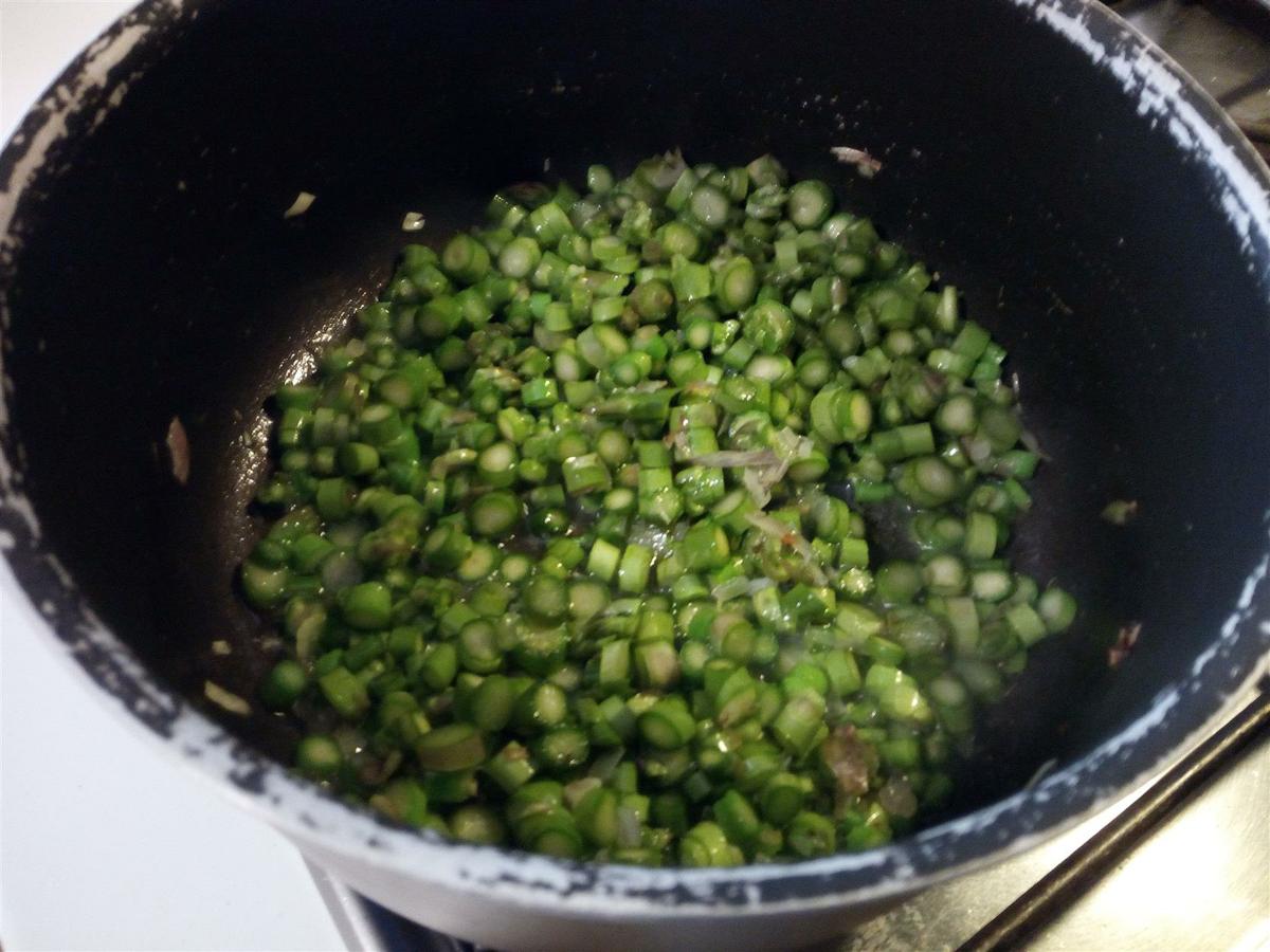 Preparar el caldo, con cebolla, apio, zanahoria y la parte final de los espárragos, que son más duros y se prestan bien para enriquecer el caldo. Limpiar los espárragos y cortarlos en rodajas. Dejar dos puntas a parte, para la guarnición, hirviendo durante 7-8 minutos en el caldo, luego retirar y conservar. Cuando el caldo está listo (yo lo dejo hervir mucho, por lo menos unos 40 minutos y durante la cocción del risotto, tiene que estar hirviendo siempre), poner la olla con aceite, ajo y chalote picado.