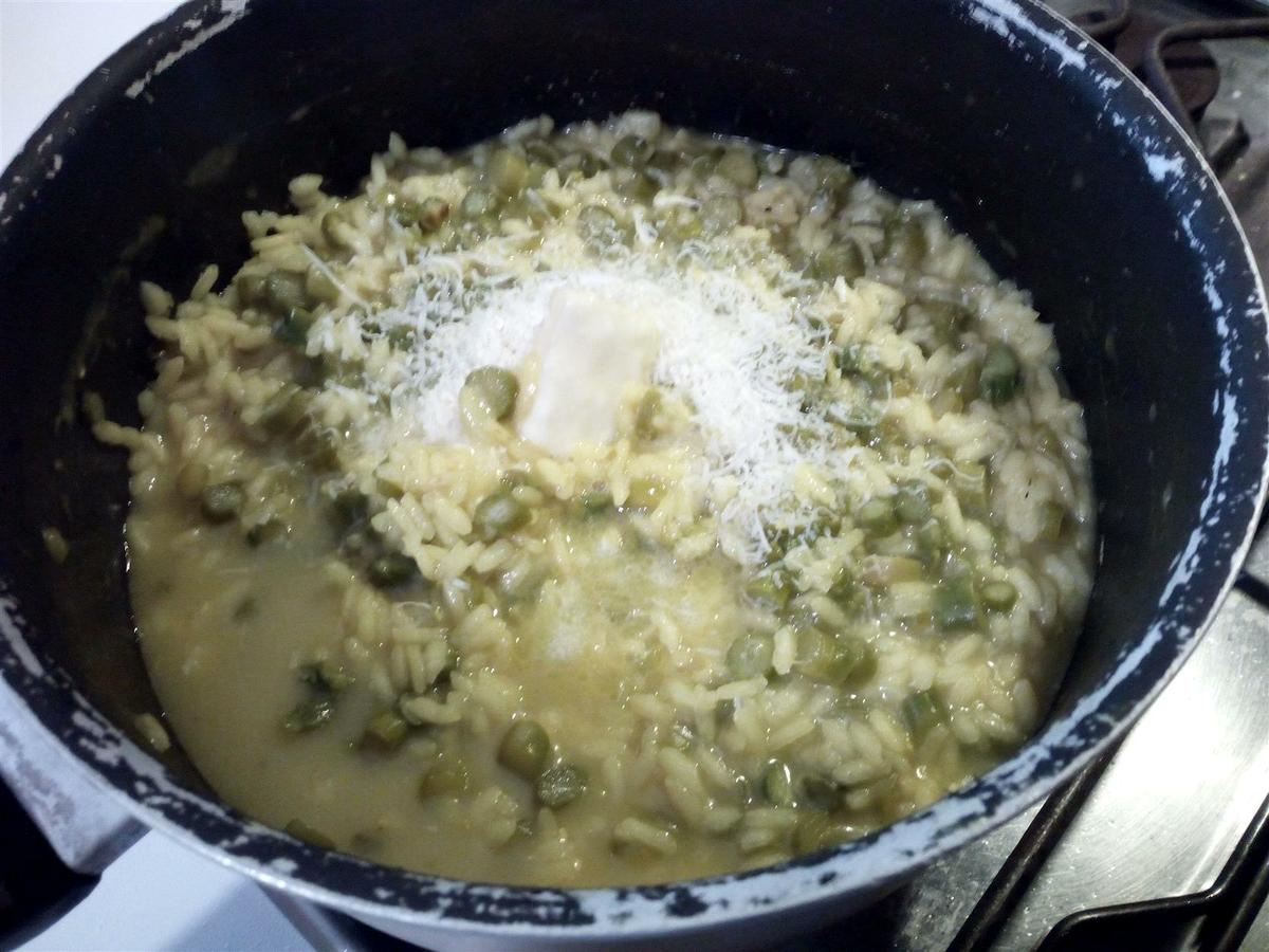 Remover hasta que se funda todo y el risotto quede cremoso. Ajustar de sal y pimienta y emplatar con aceite en crudo y las puntas de espárragos anteriormente hervidas.