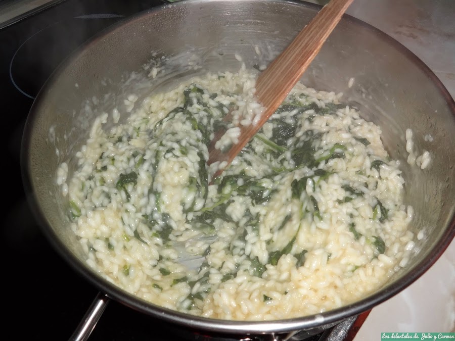 Cuando apenas nos quede caldo para echar, verteremos las espinacas y lo removeremos de forma que se distribuyan bien por todo el arroz.