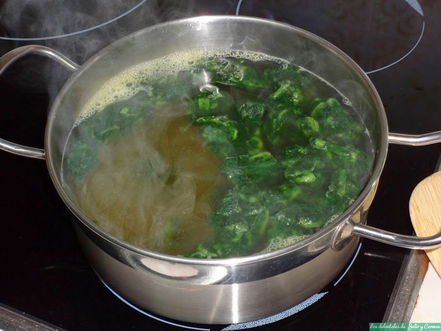 En una olla, coceremos las espinacas en agua hirviendo con una pastilla de caldo de pollo. Cuando estén cocidas (tras 5-7 minutos una vez el agua vuelva a hervir), las sacamos, refrescamos bajo el grifo y las escurrimos bien, aplastandolas con la mano para eliminar todo el agua.