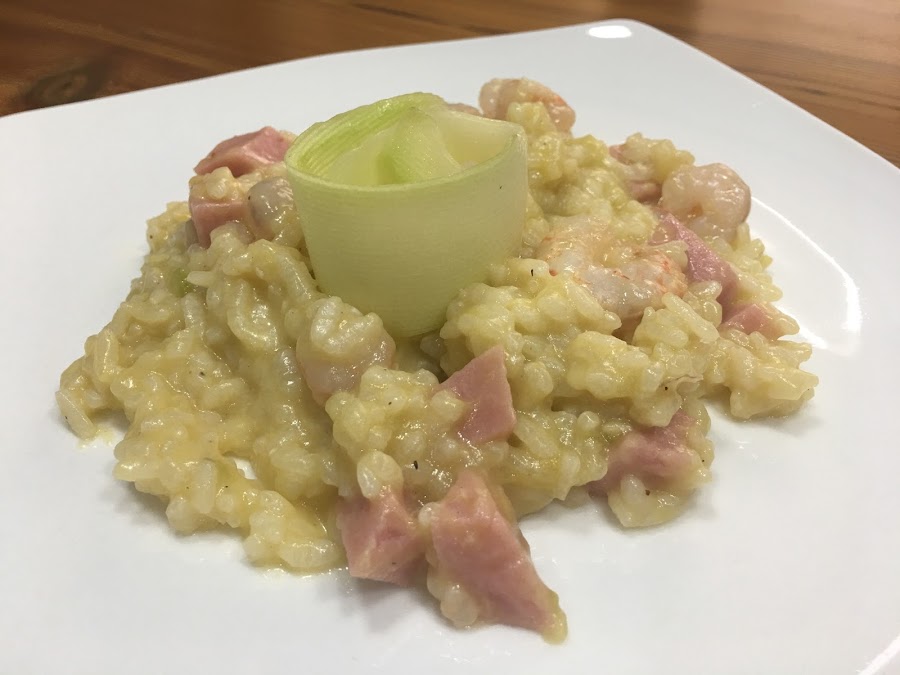 Finalmente añade el parmesano, el jamón cocido y las gambas, mezcla con la espátula y deja reposar en el vaso cerrado unos 4- 5 minutos. (El arroz terminará de cocerse y también las gambas). Servir en una fuente.