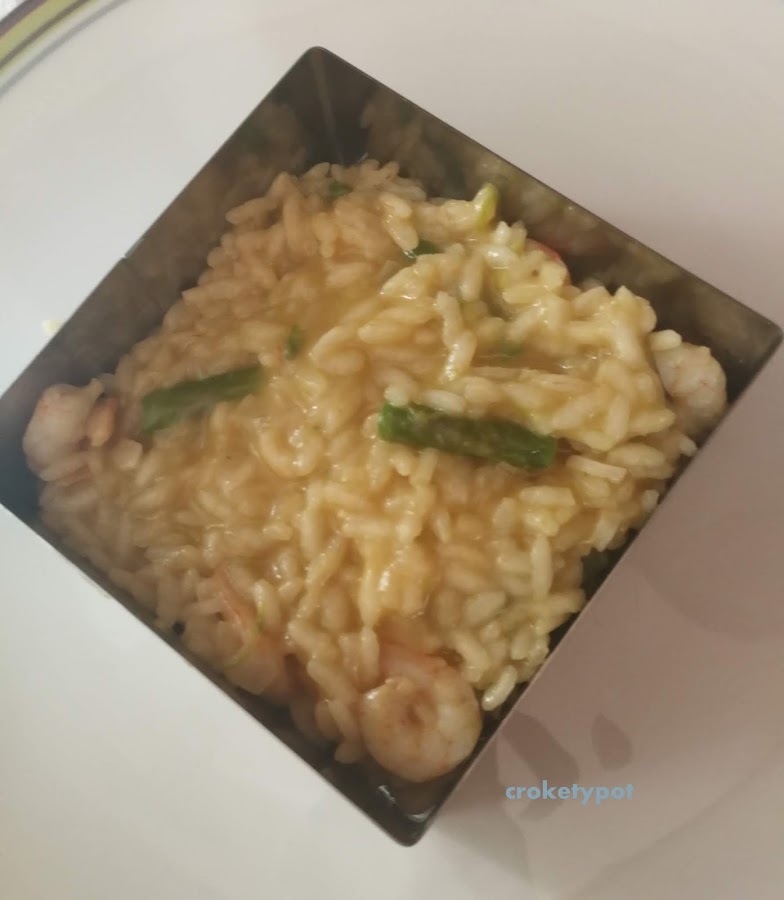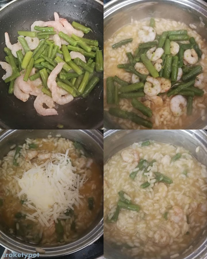 Mientras en una sartén salteamos las gambas peladas con los espárragos cocidos, vuelta y vuelta y se añaden al risotto, cuando lo tenemos terminado. Entonces le rallamos el parmesano y se añade un trozo de mantequilla, se mueve bien hasta que queda integrado y tapamos, se deja reposar 5 minutos.