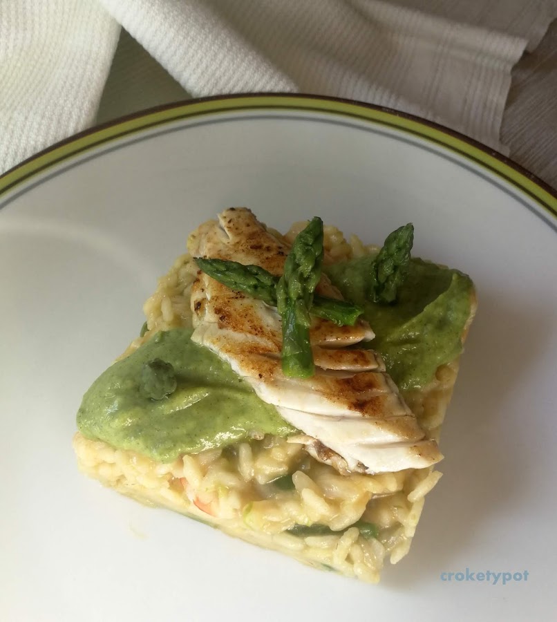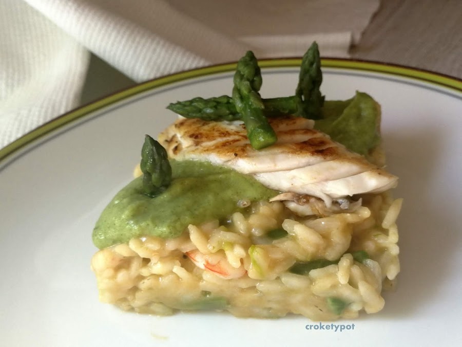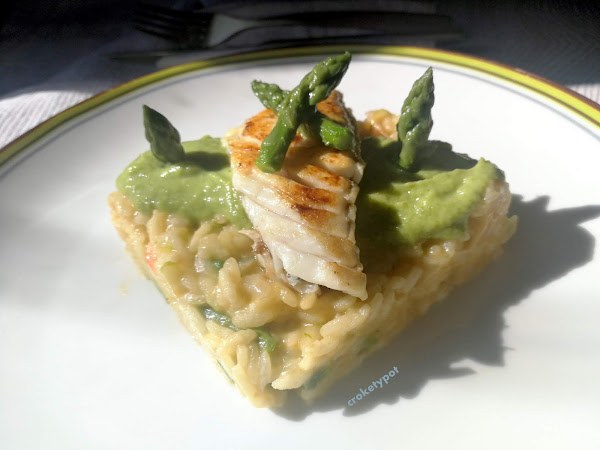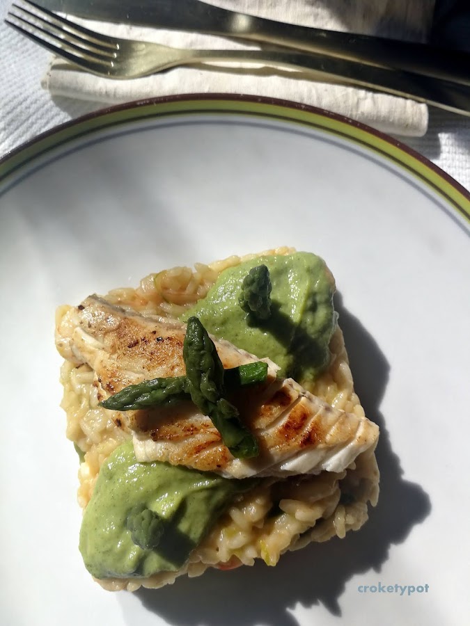 Sobre el risotto ponemos la crema de brócoli y los filetes de dorada, para adornar unas puntas de espárrago. Y ¡a disfrutar!