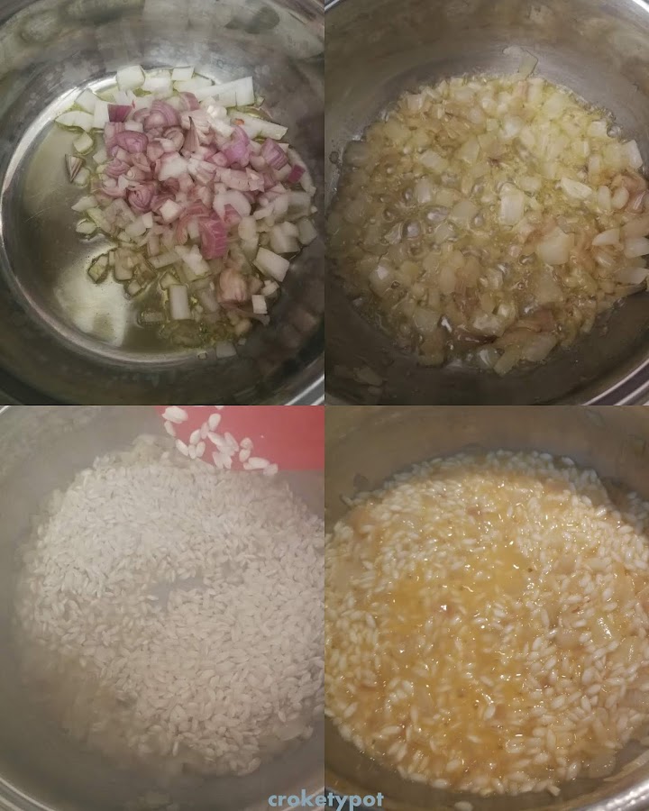 El risotto es un plato de origen italiano, que se elabora aderezado con pocos ingredientes, básicamente cebolla, mantequilla, vino blanco, caldo de carne o gallina, queso parmesano, sal, pimienta y azafrán, y luego "algo más" que es lo que da identidad al plato.