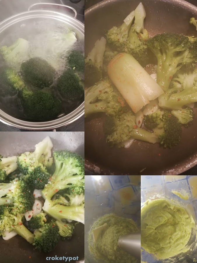 Para la crema de bróculi: Cocemos el bróculi 10 minutos, luego con un ajo picado lo salteamos junto con chile en copos, un pellizco de sal y el puerro de cocer con las cabezas de gambas. Lo pasamos todo por la batidora y reservamos.