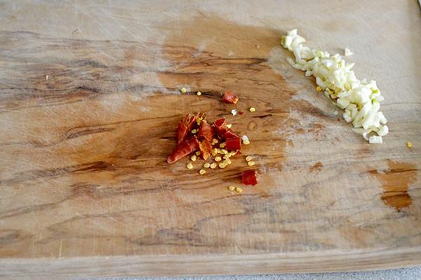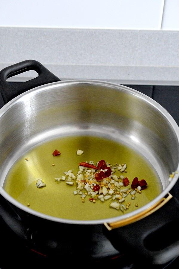 En una cazuela mas baja, calentamos un chorro de aceite y sofreímos el ajo junto con la guindilla.