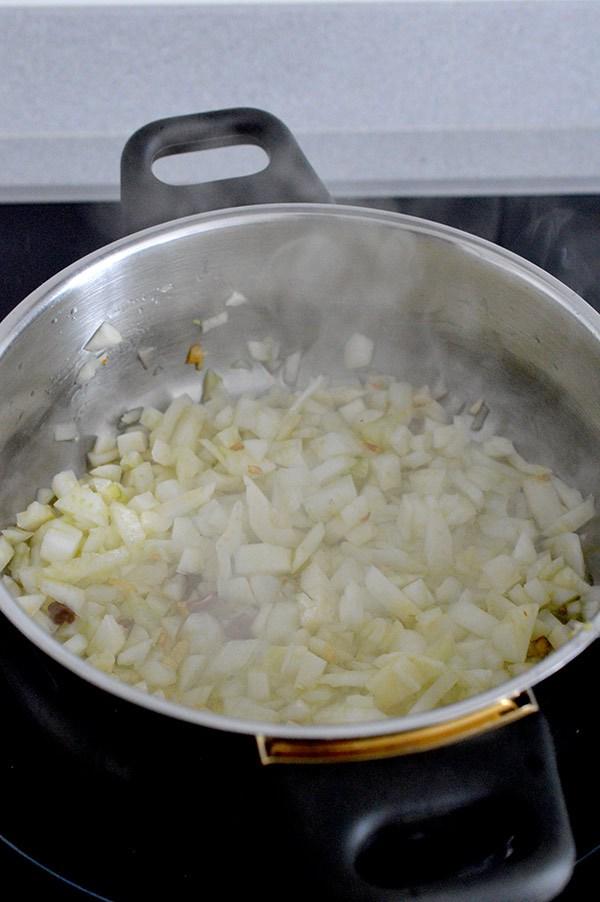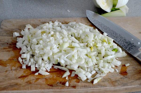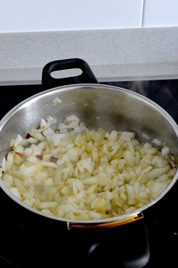 Añadimos primero el hinojo y luego la cebolla y sofreímos a fuego medio hasta que se dore ligeramente.