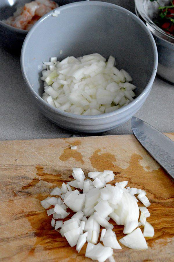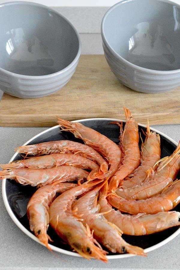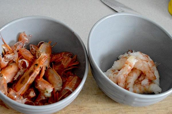 Limpiamos los gambones retirando la cascara y la cabeza, así como el intestino con la ayuda de un cuchillo.