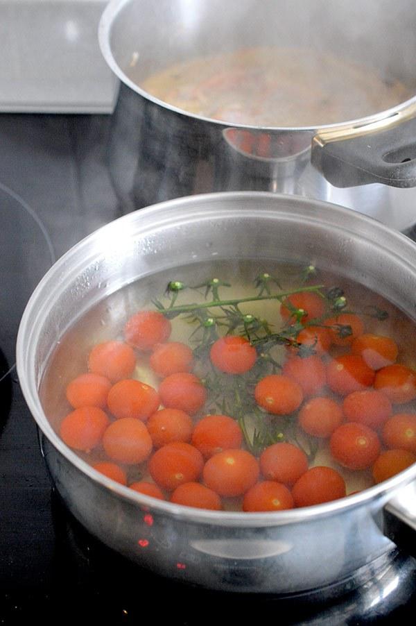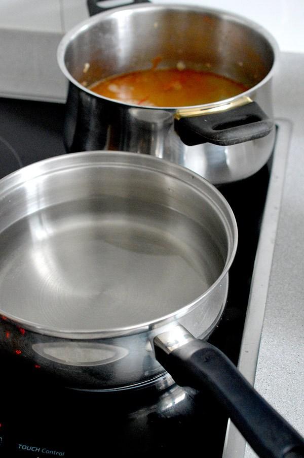 Ponemos a cocer agua en un cazo para pelar los tomates.