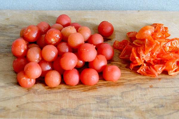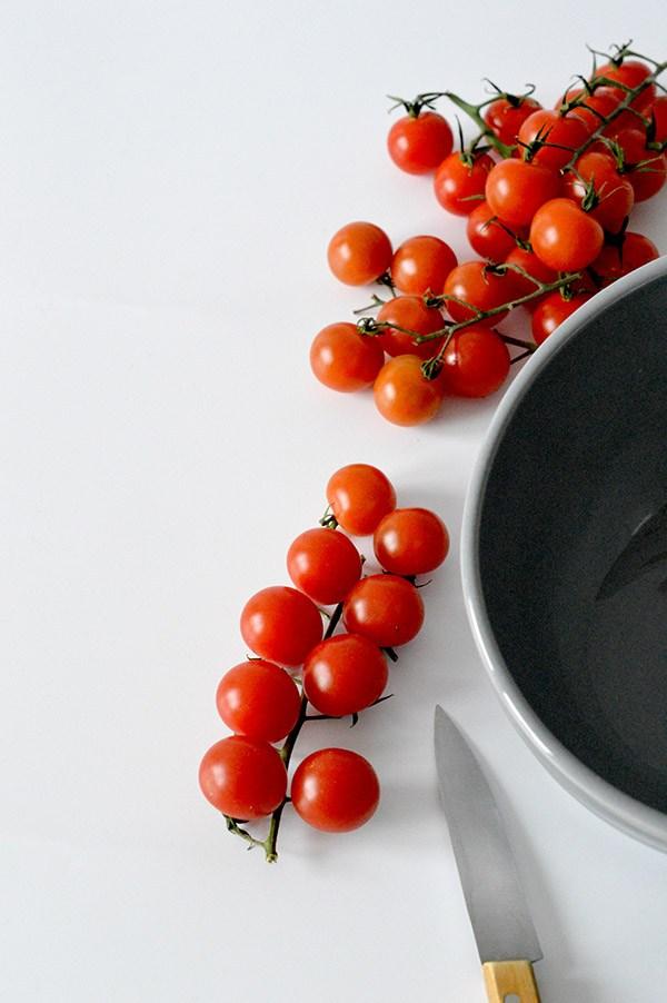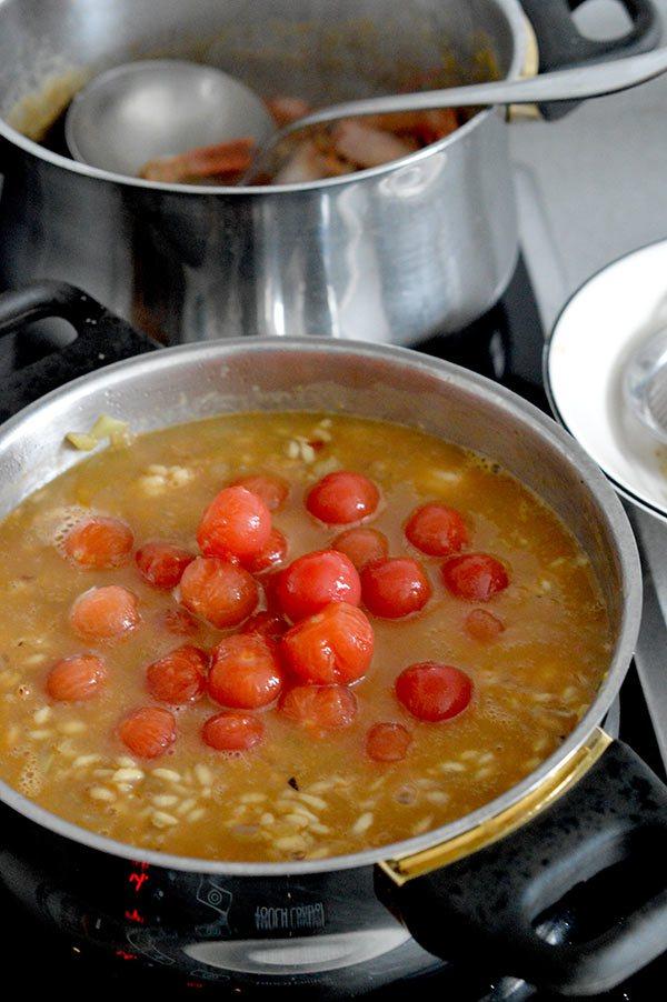 En los últimos 5 minutos añadimos las gambas y los tomates cherry.