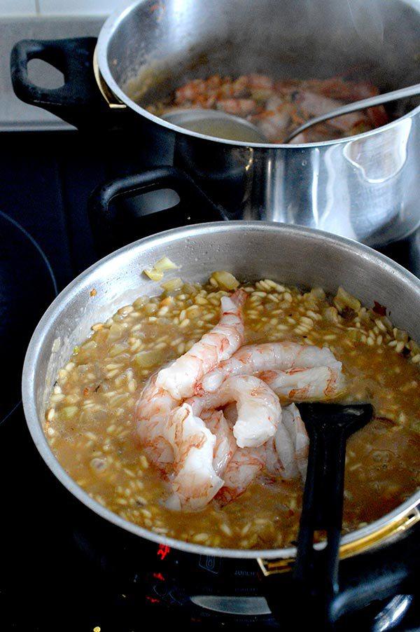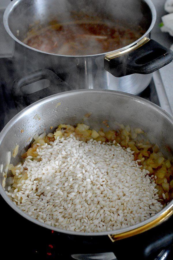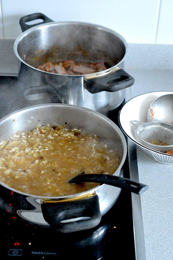 Con la ayuda de un colador vamos añadiendo el caldo, cazo a cazo y vamos removiendo constantemente durante unos 18-20 minutos.