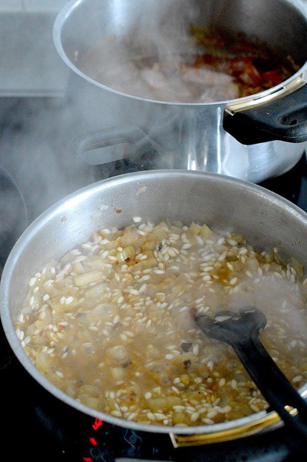 Añadimos el arroz al sofrito, y sofreímos durante 3 minutos mas.