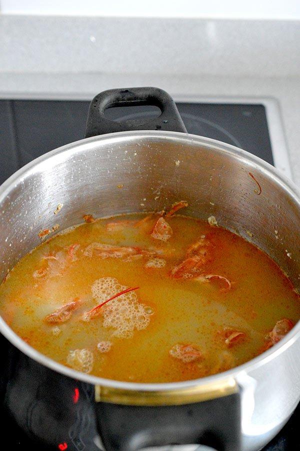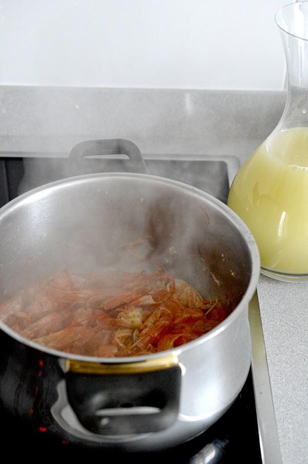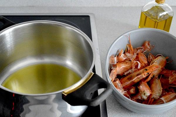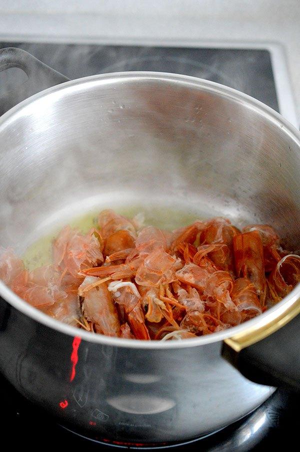 En una cazuela alta ponemos a calentar un chorrito de aceite y tostamos las cabezas y la cascaras de los gambones, aplastando las cabezas con la ayuda de un utensilio de madera para que salga todo el jugo.