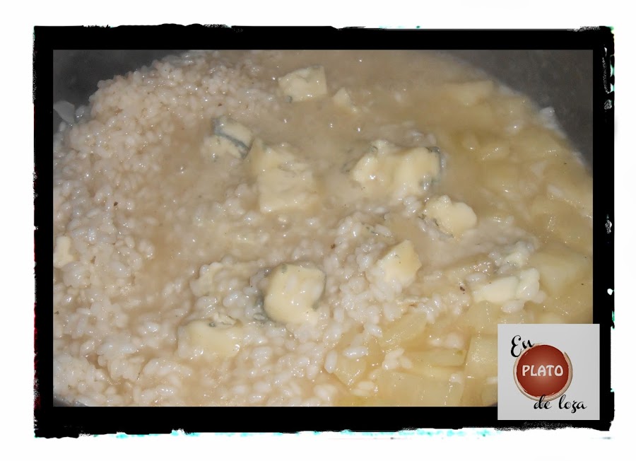 Cuando le quede poco al arroz le echamos la mitad de las peras y el queso que hemos cortado a daditos. Las peras se irán deshaciendo con la cocción, por eso reservamos la otra mitad que añadiremos en el momento de apartar el plato así conseguimos que una parte de ellas nos proporcionen sabor en el guiso y la otra parte conformarán la parte sólida de nuestro risotto. El queso, por otra parte, se irá fundiendo con el calor y dará una textura cremosa y exquisita.