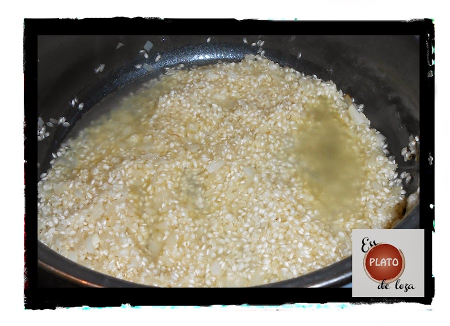 Una vez tengamos así la cebolla, añadimos el arroz y removemos unos minutos para que éste suelte el almidón. Lo mantendremos así hasta que el corazón del arroz se vea blanco y el resto del grano esté transparente. Esa es la señal de que el arroz ya pide agua o, al menos, algún líquido. Añadimos entonces el vino y lo mantenemos en el fuego, reduciéndolo para que expulse el alcohol.