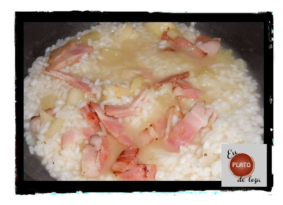 Lo vamos haciendo así, hasta que el arroz este reblandecido y le quede unos cinco minutos. Es el momento en el que desdoblé la cocción y aparté un plato para hacer el Risotto con bacon y peras por una parte, y con gorgonzola y peras por otra. Lo voy explicando por separado.