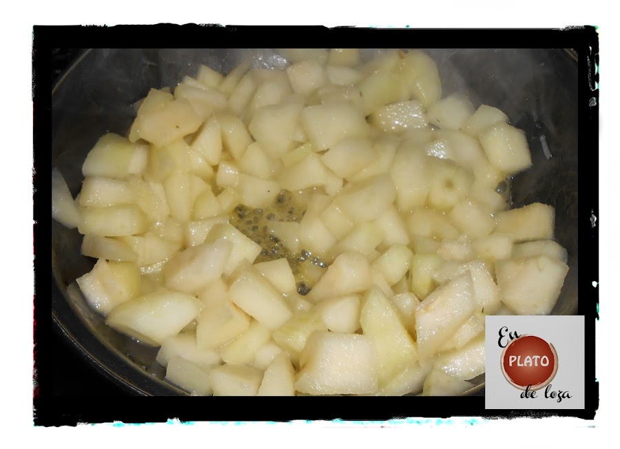 Mientras está cociendo el arroz pelamos las peras y las cortamos en dados. Las sofreimos en una sartén durante cinco minutos hasta que estén blanditas pero no doradas ya que no queremos elementos "negros" en el color del plato.