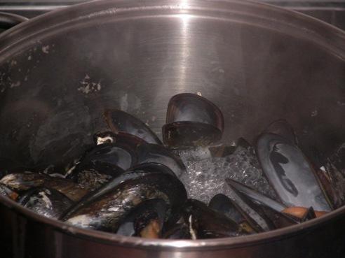 Por un lado ponemos el caldo de verduras a calentar y en otra cazuela abrimos los mejillones con un chorrito de vino blanco, cuando estén abiertos añadimos el caldo al de verduras pasándolo por un colador.