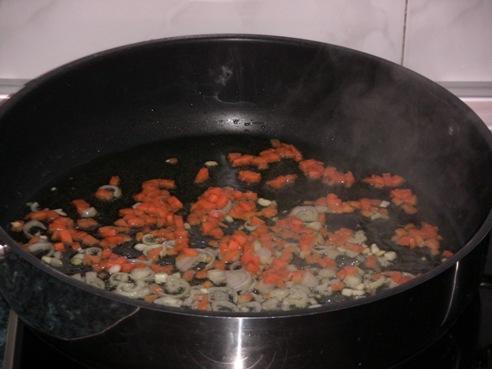 Aquí añadimos los langostinos y los mejillones, si lo hacemos antes se destrozarán porque estaremos removiendo continuamente.