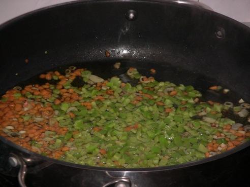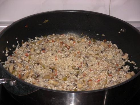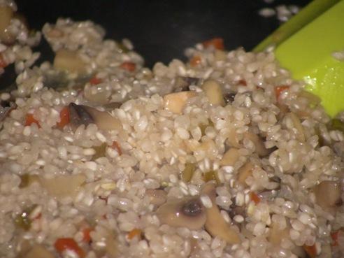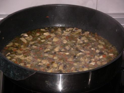 En la cazuela que vamos a hacer el risotto, ponemos a pochar los ajos, las chalotas todo ello bien picadito, la zanahoria y finalmente el pimiento verde. Cuando esté todo a medio freír añadimos los champiñones, rehogamos e inmediatamente añadimos el vino blanco, dejando cocer todo unos 5 minutos.