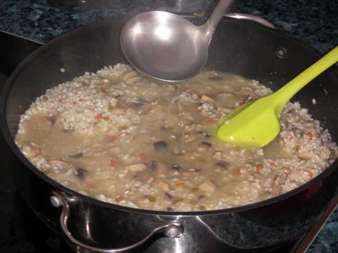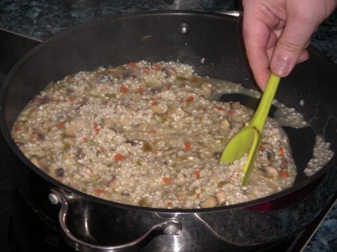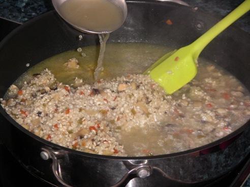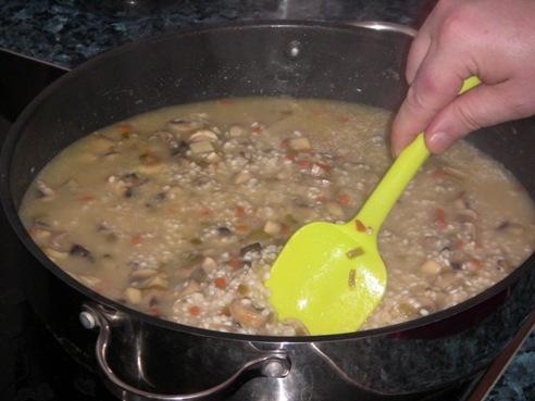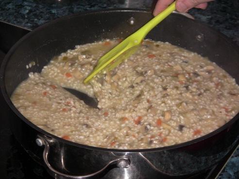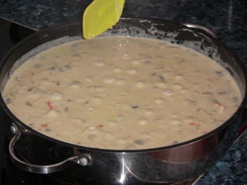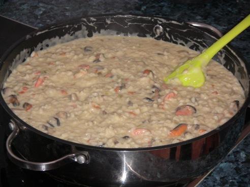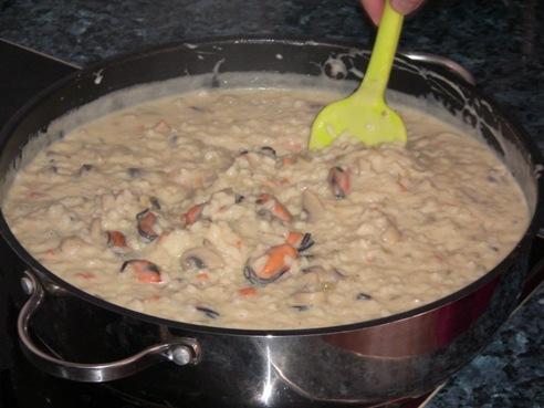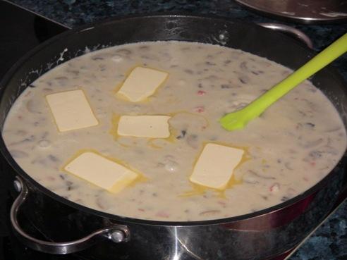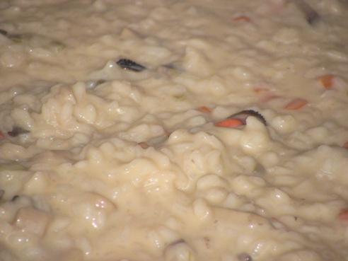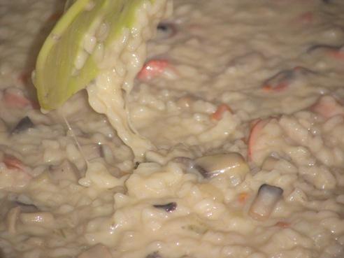 Según se va bebiendo el caldo el arroz, vamos poniendo más, lo haremos en tres veces, siempre esperando a que se vaya secando, finalmente ponemos la nata (crema de leche), la mantequilla y el queso parmesano, removemos todo bien cuidando de que no se pegue al fondo.