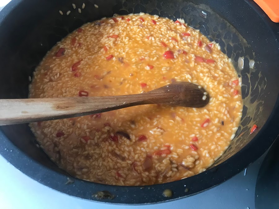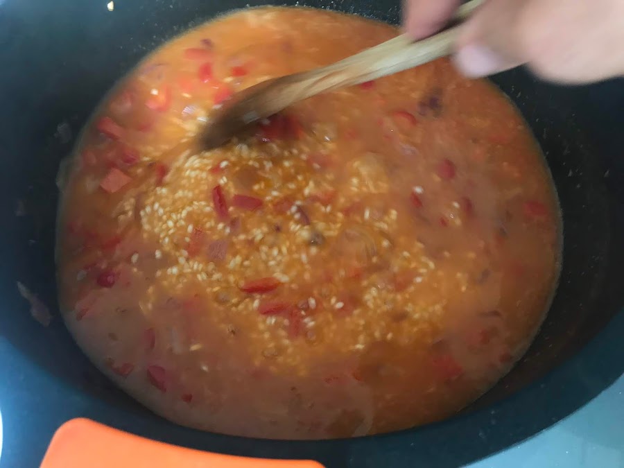 Cada vez que se abosorbe el caldo vamos poniendo más sobre la cazuela.