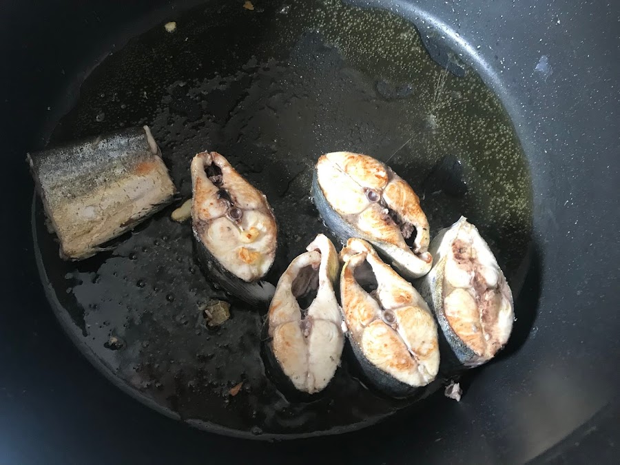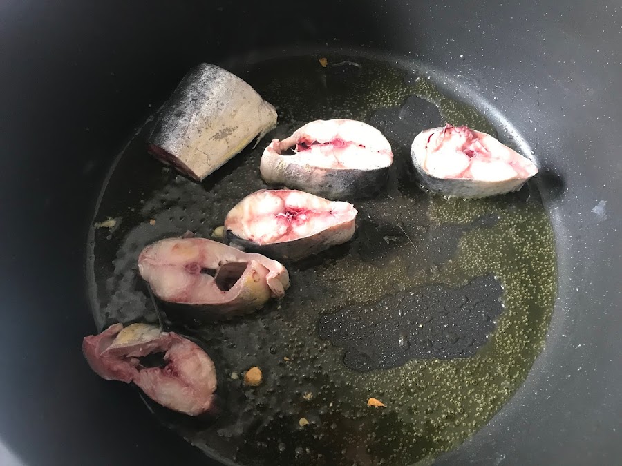 Freímos la llampuga para darle sabor al aceite y para darle el primer toque de cocinado.
