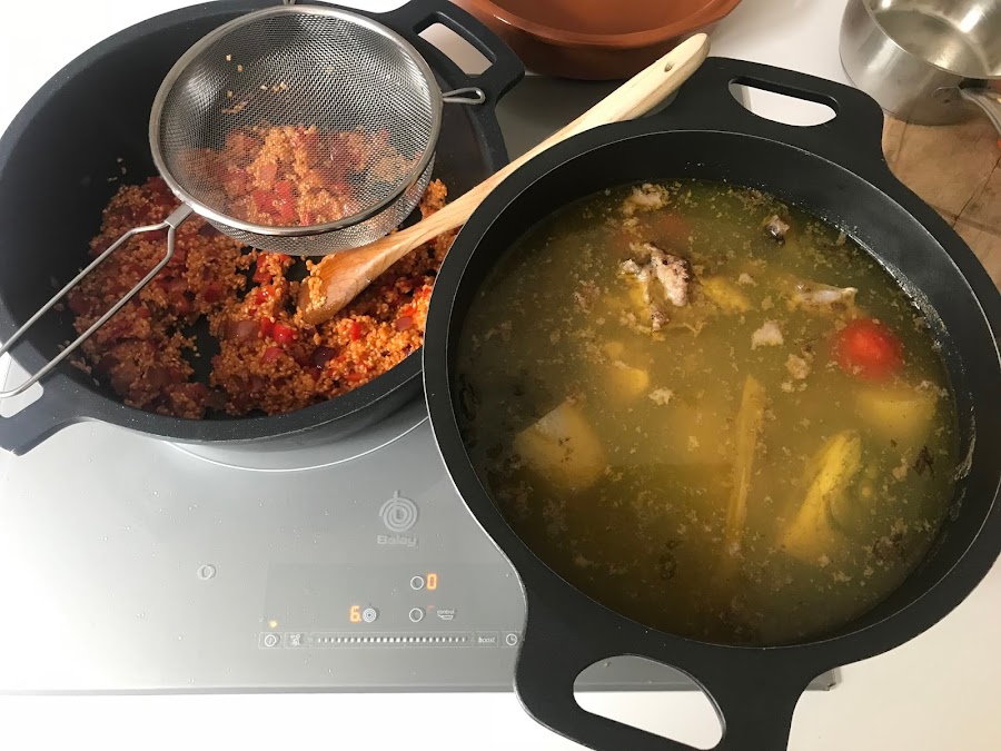 Elaboramos el fumet de pescado, en una olla ponemos primero el aceite y la verdura, la sofreímos un poco y después ponemos el agua, la dejamos cocer durante 30 minutos.