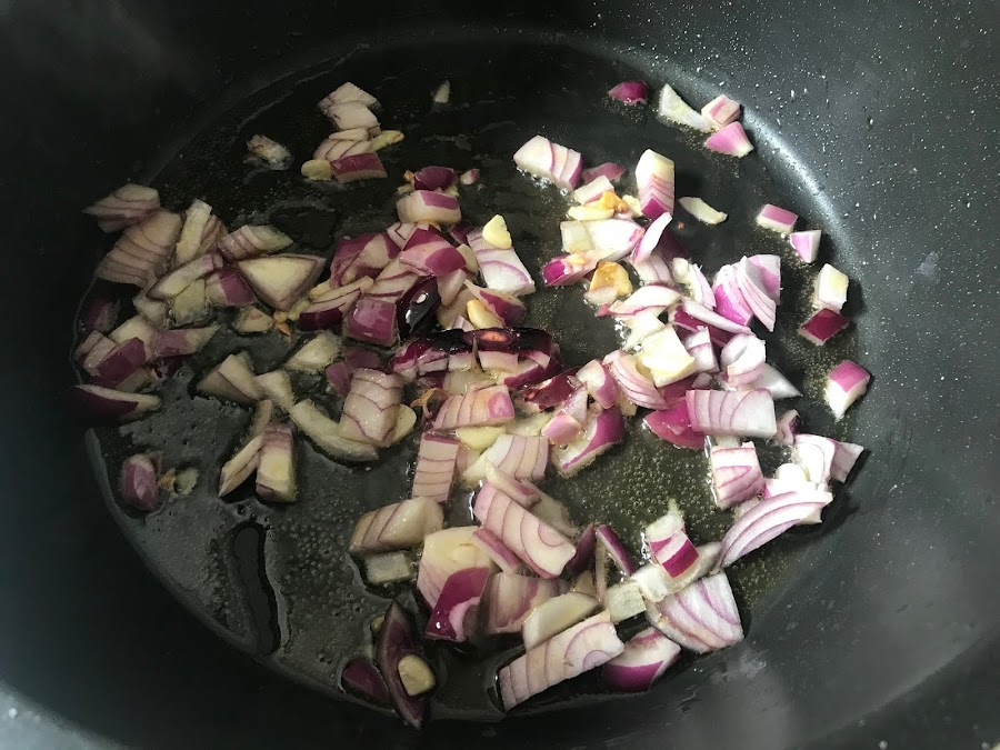 En la misma cazuela ponemos la cebolla roja cortada fina.