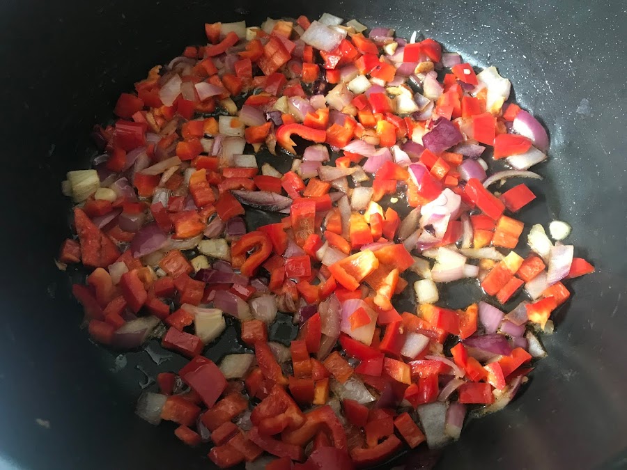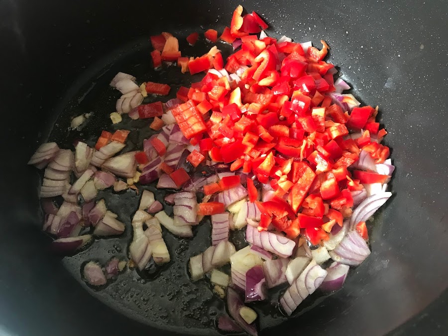 Cuando empieza a ponerse transparente incorporamos el pimiento cortado a trozos pequeños.