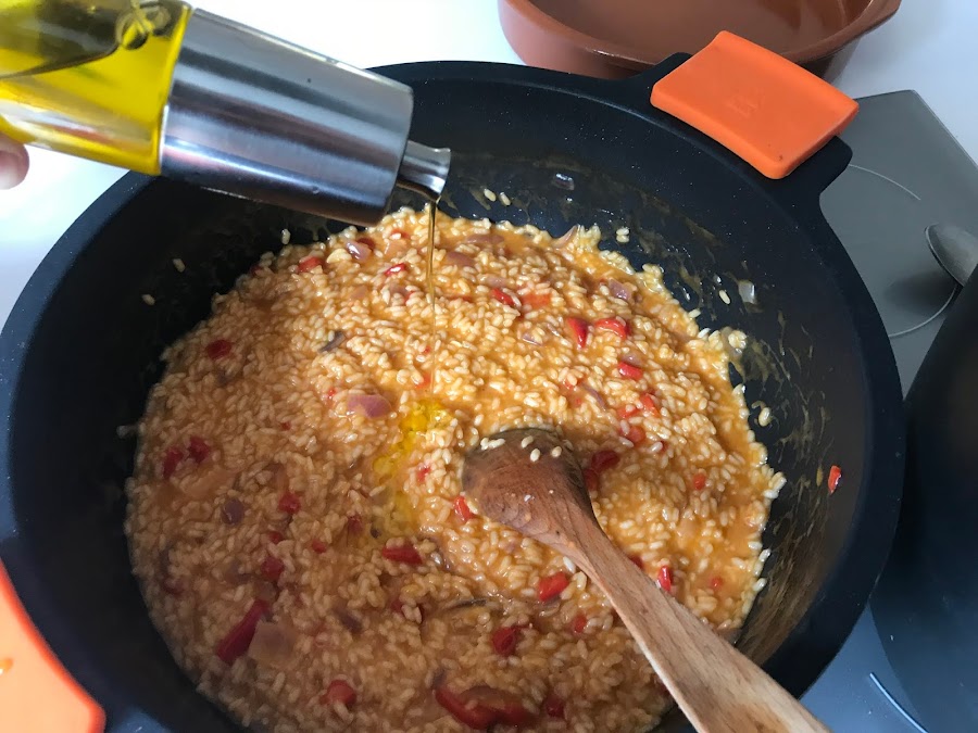 Movemos durante 1 minuto para juntar todo el aceite en el arroz y así mantecarlo correctamente.