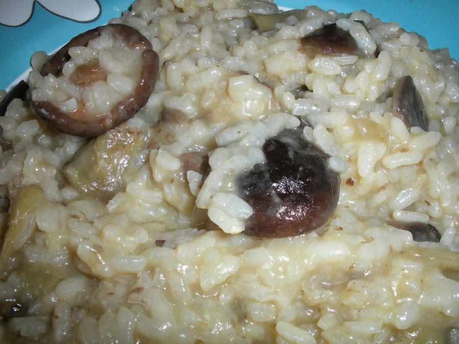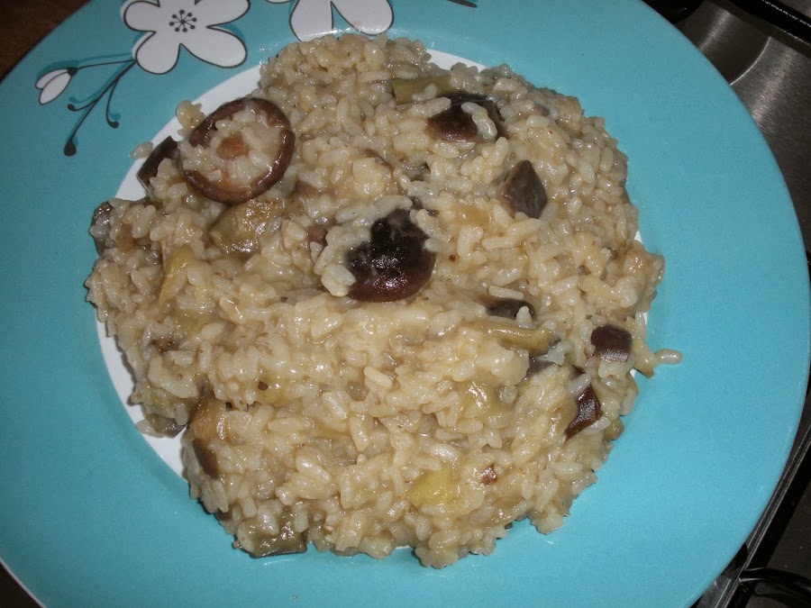 Dejamos cocer a fuego lento y cuando la berenjena este doradita añadimos las setas. Estas tardan unos 10 minutos en hacerse, lo sabremos una vez se haya evaporado el agua que sueltan.