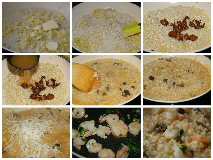 En una sartén saltear las gambas con un poco de ajo y perejil. Añadirlas por encima del risotto y servir.