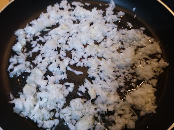 Picamos muy bien la cebolleta y la pochamos en una sartén amplia con un poco de aceite.