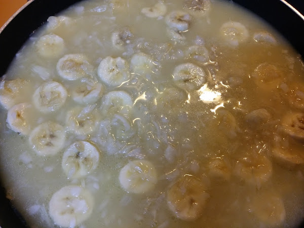 Lo removemos todo bien y añadimos ahora los plátanos cortados en trozos o rodajas.